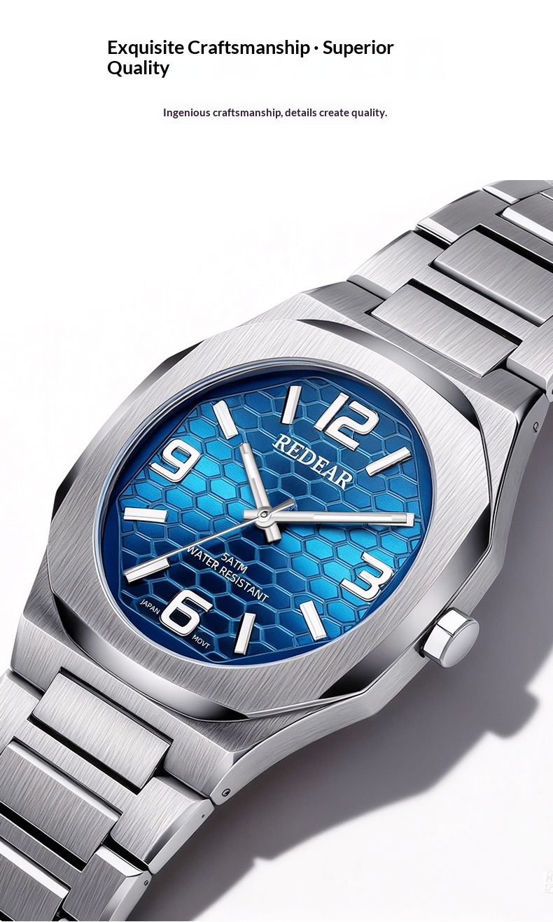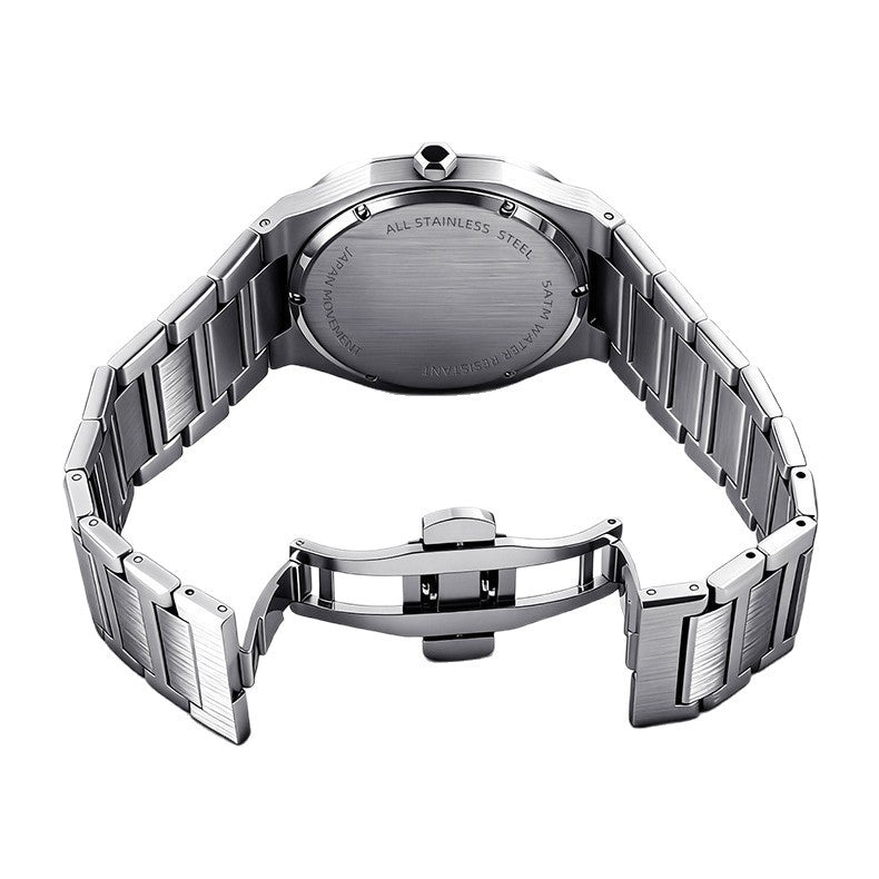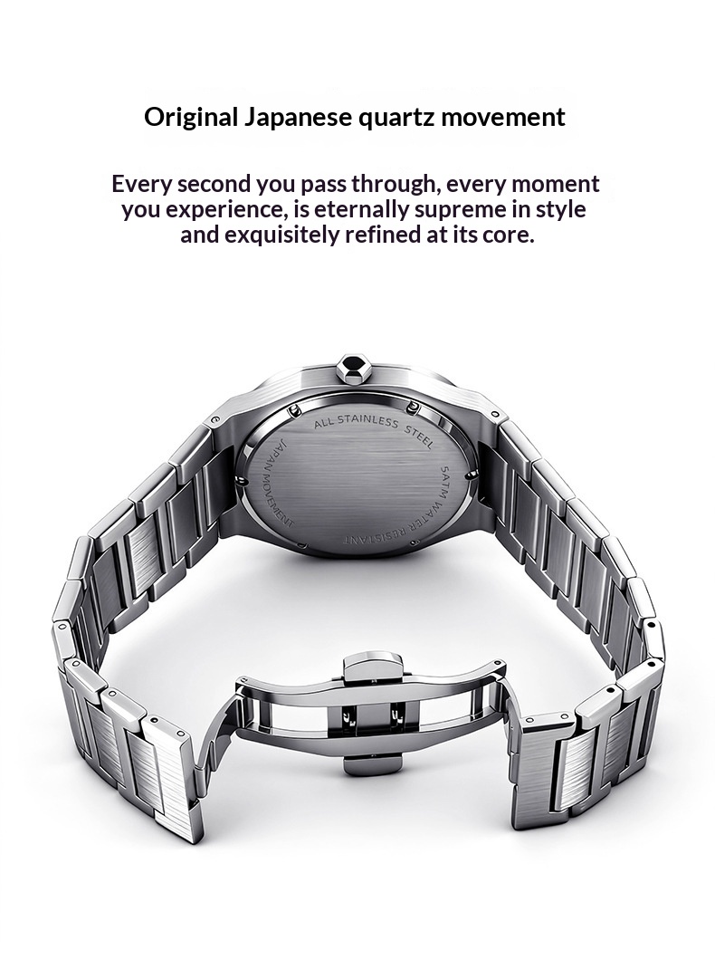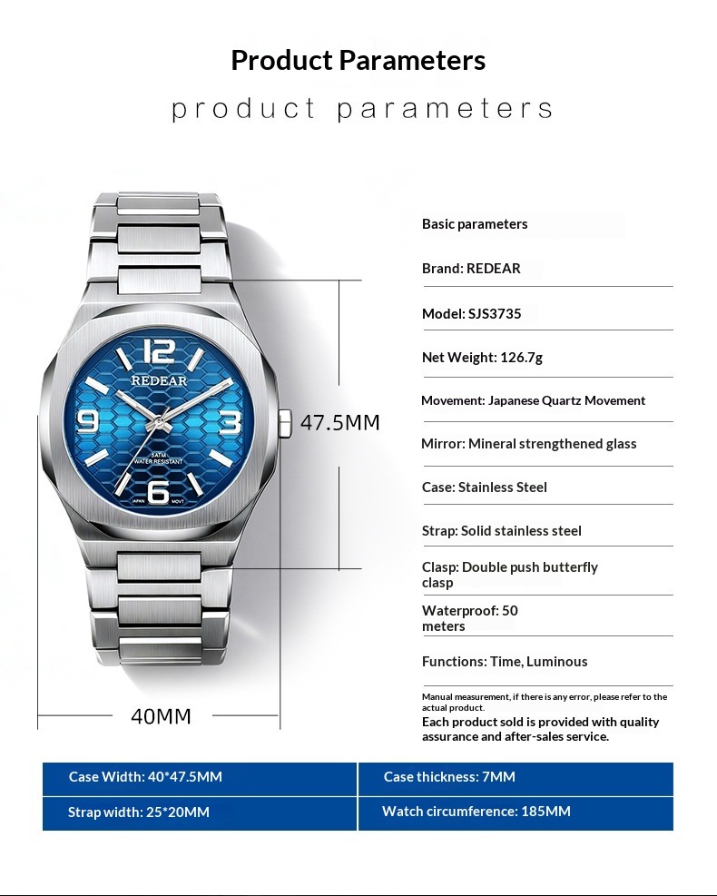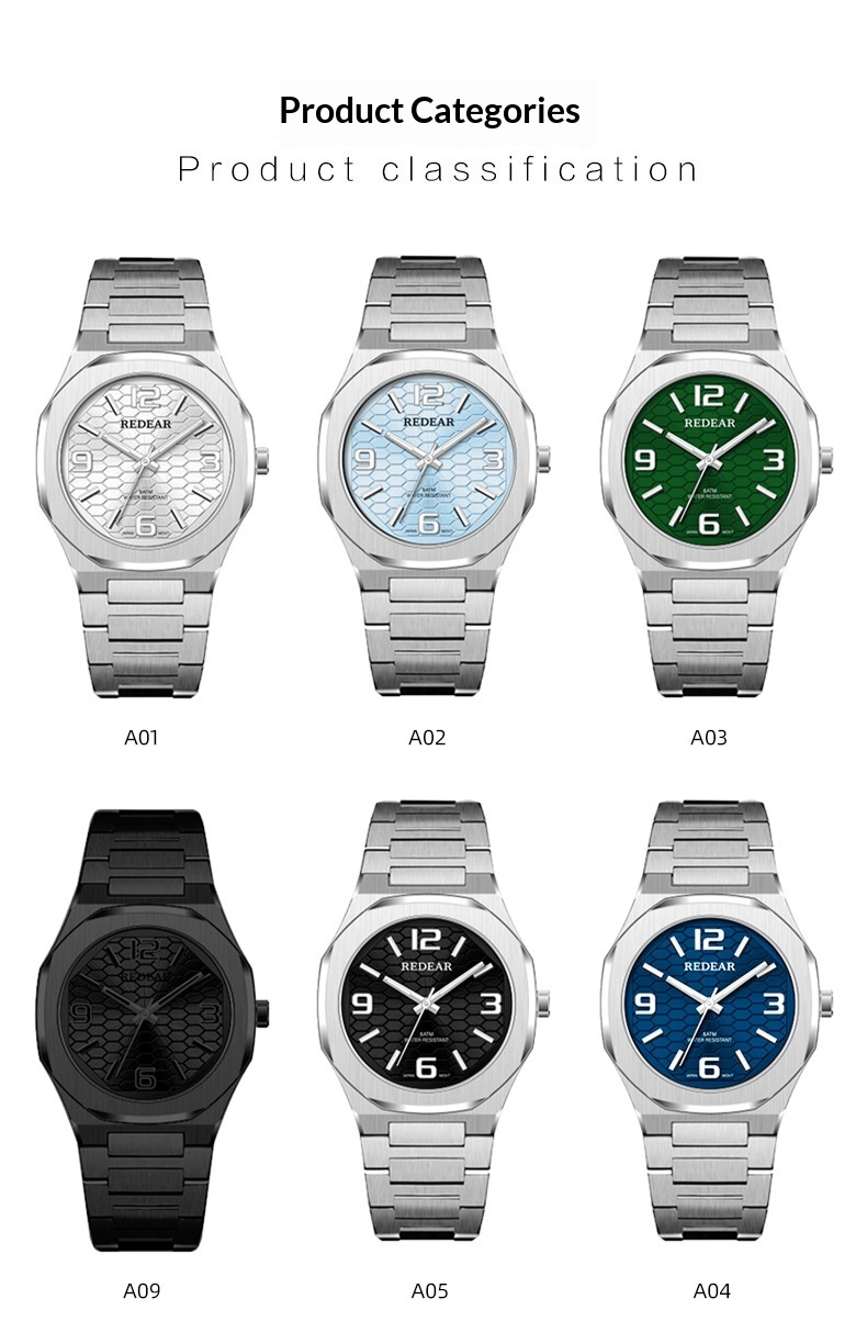 Colors: SJS3735-S02-1—steel case with a silver dial; SJS3735-S02-2—steel case with a light blue dial; SJS3735-S02-3—steel case with a green dial; SJS3735-S02-4—steel case with a black dial; SJS3735-S02-6—steel case with a dark blue dial; SJS3735-S02-9—black case with a black dial and black numerals.