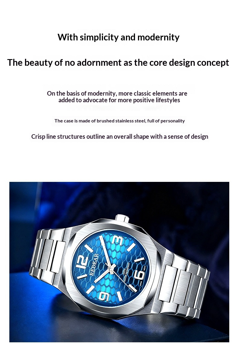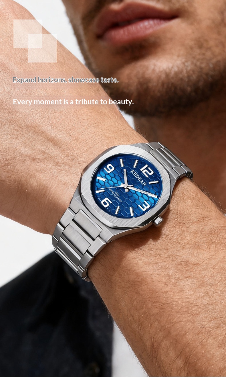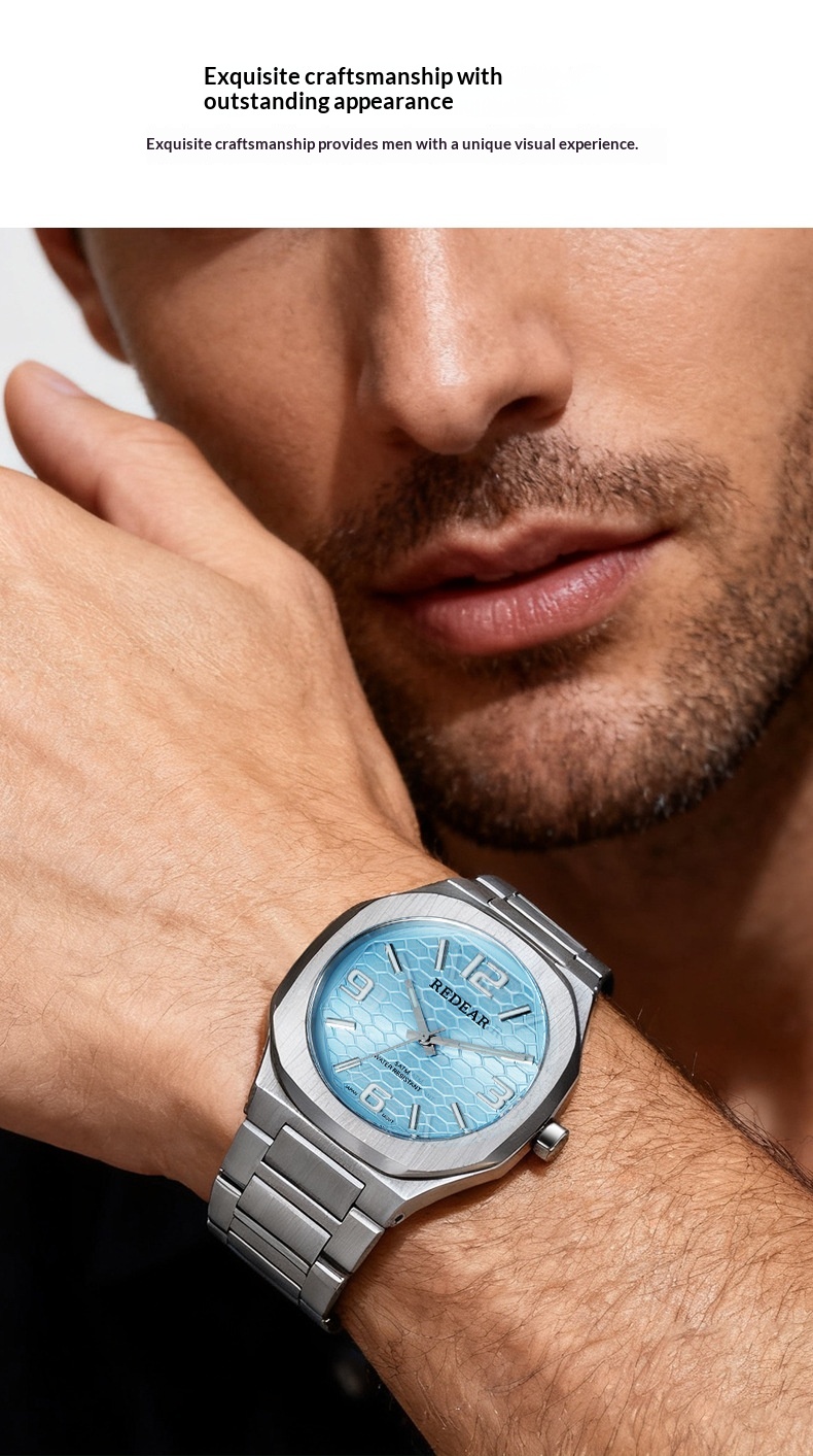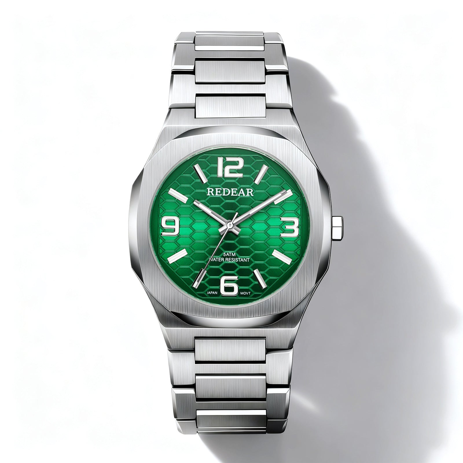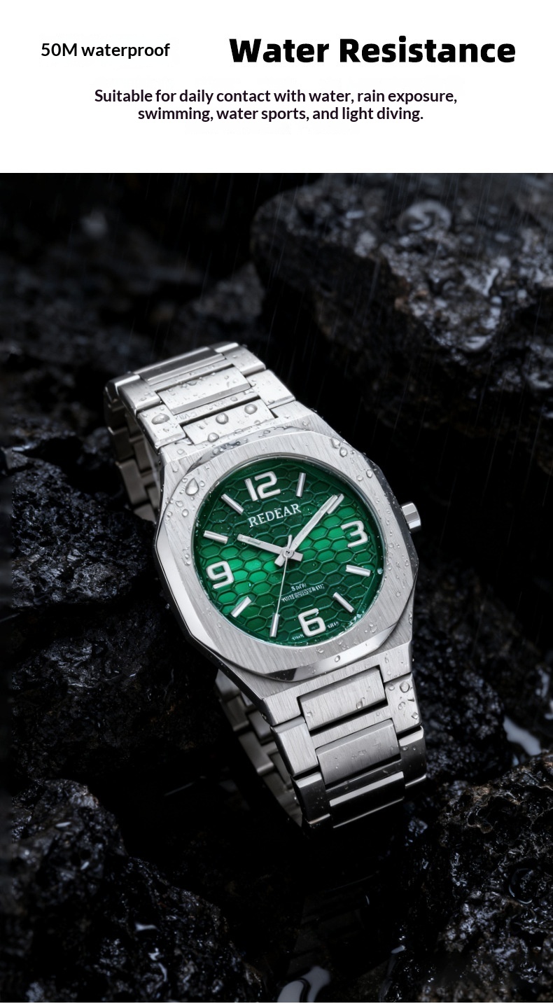 Colors: SJS3735-S02-1—steel case with a silver dial; SJS3735-S02-2—steel case with a light blue dial; SJS3735-S02-3—steel case with a green dial; SJS3735-S02-4—steel case with a black dial; SJS3735-S02-6—steel case with a dark blue dial; SJS3735-S02-9—black case with a black dial and black numerals.