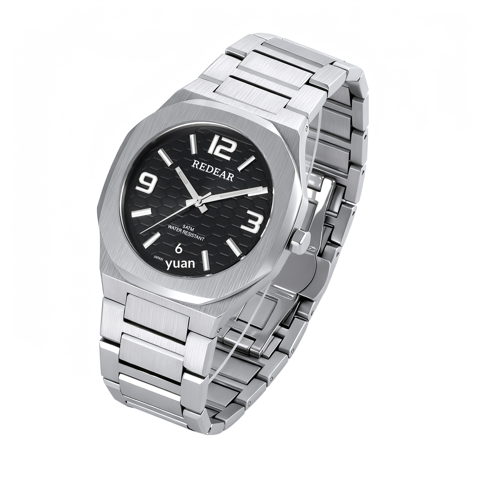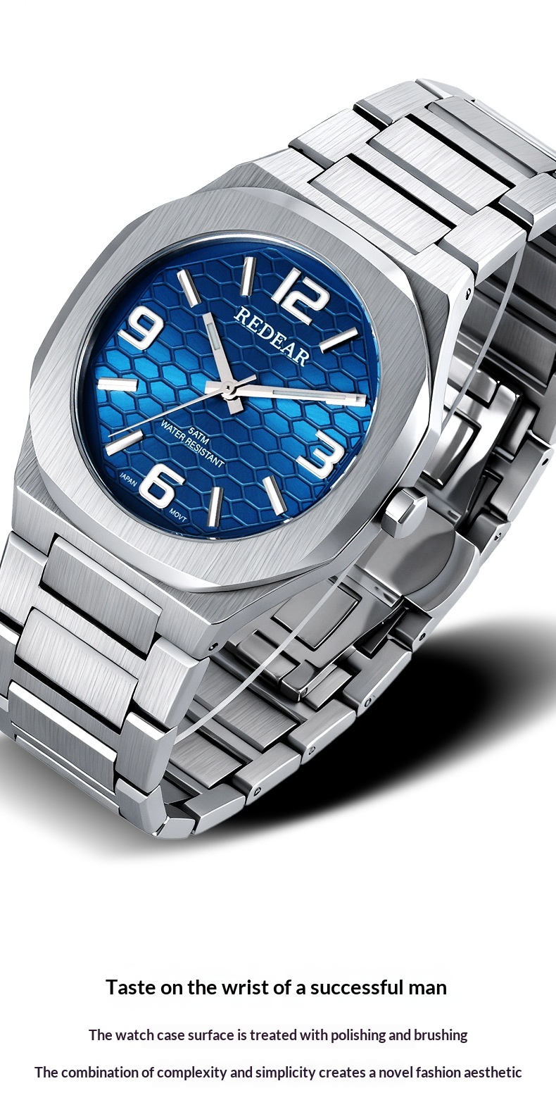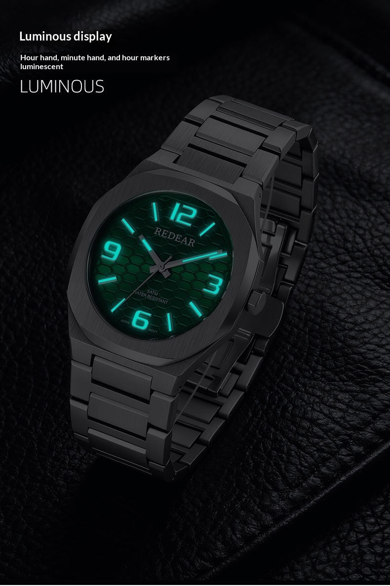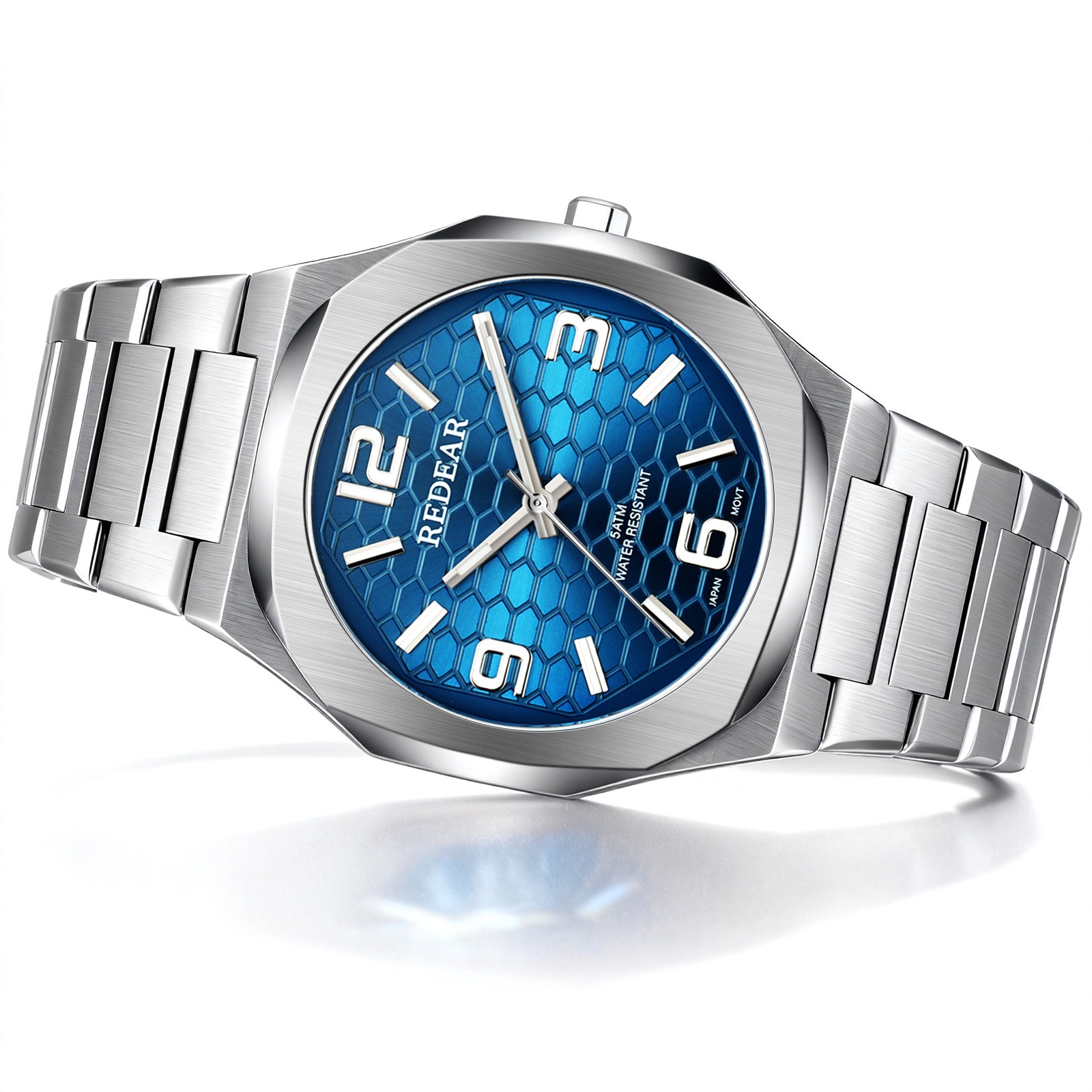 Colors: SJS3735-S02-1—steel case with a silver dial; SJS3735-S02-2—steel case with a light blue dial; SJS3735-S02-3—steel case with a green dial; SJS3735-S02-4—steel case with a black dial; SJS3735-S02-6—steel case with a dark blue dial; SJS3735-S02-9—black case with a black dial and black numerals.